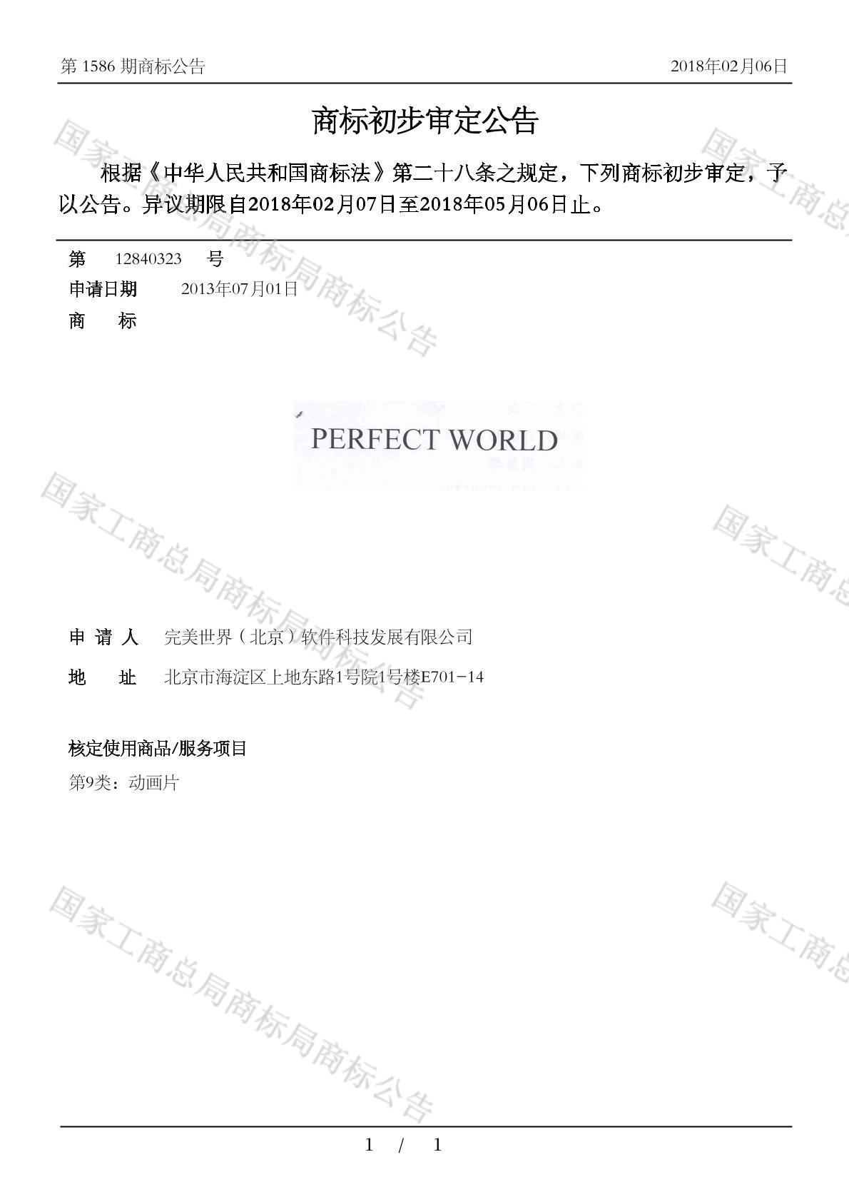PERFECT WORLD 商标初步审定公告