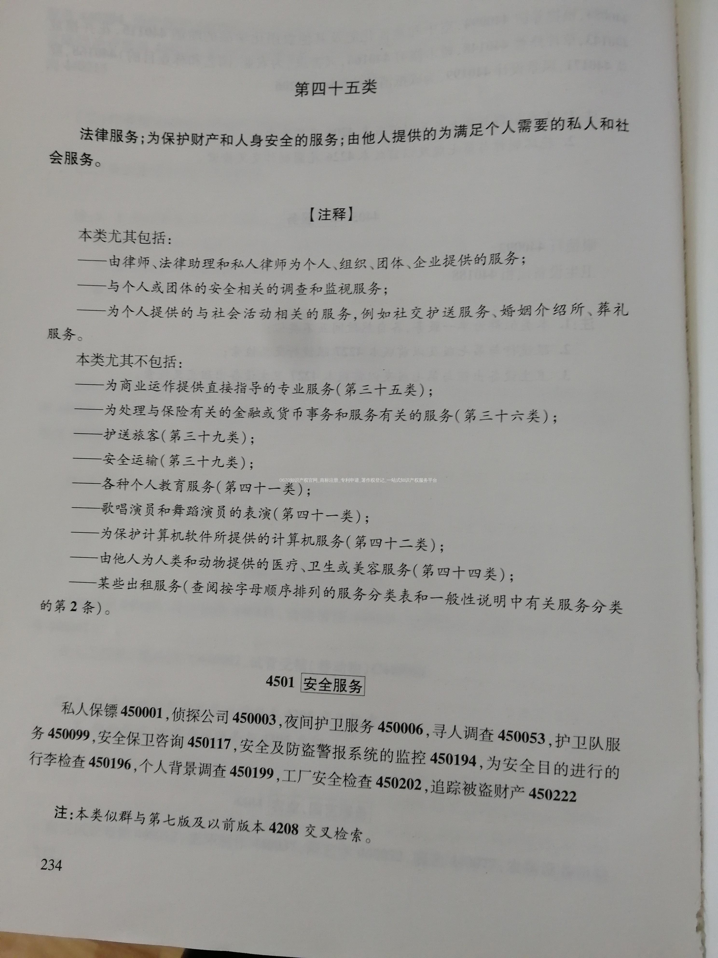 私人保镖 450001 , 侦探服务 450003 , 夜间护卫服务 450006 , 寻人调查 450053 , 警卫服务 450099 , 实体安全保卫咨询 450117 , 安全及防盗警报系统的监控 450194 , 行李安检 450196 , 个人背景调查 450199 , 工厂安全检查 450202 ,追踪被盗财产 450222