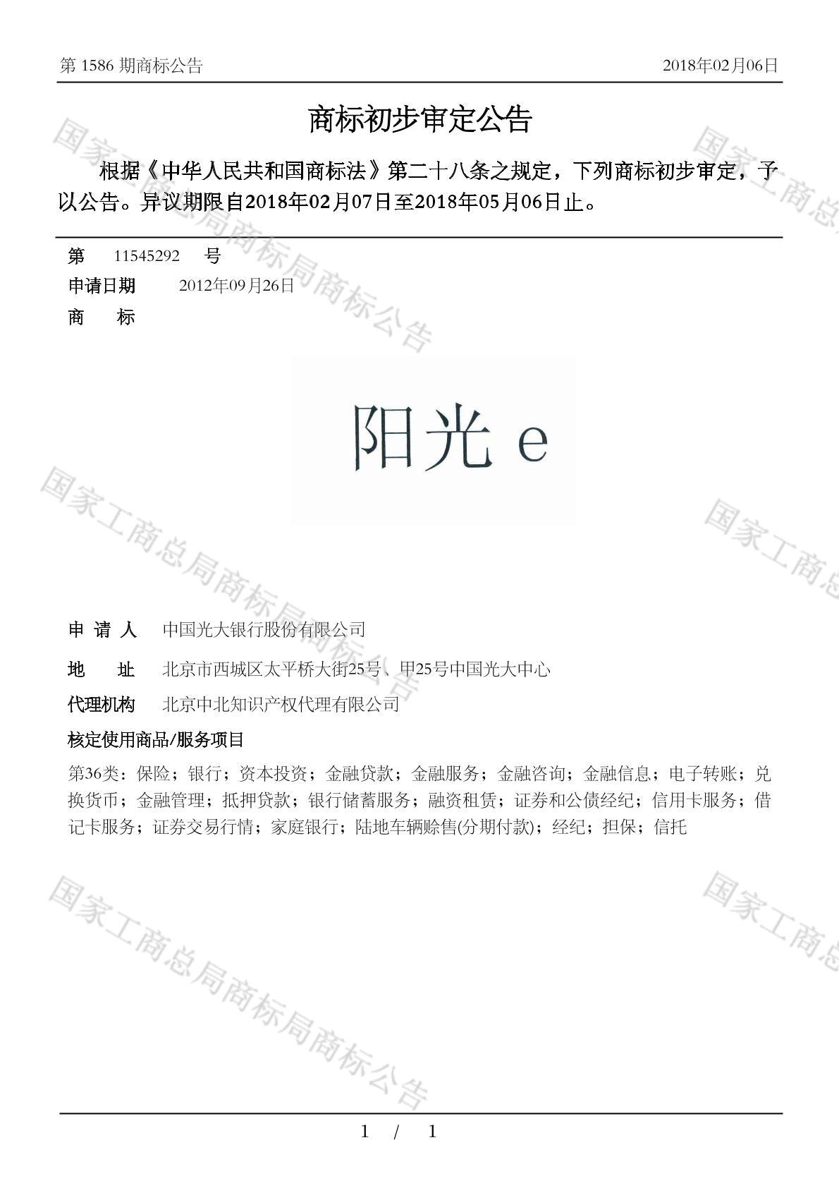 | 1586 | 43137 | 商標初步審定公告 | 11545292 | 中國光大銀行股份有限公司 | 陽光 E |