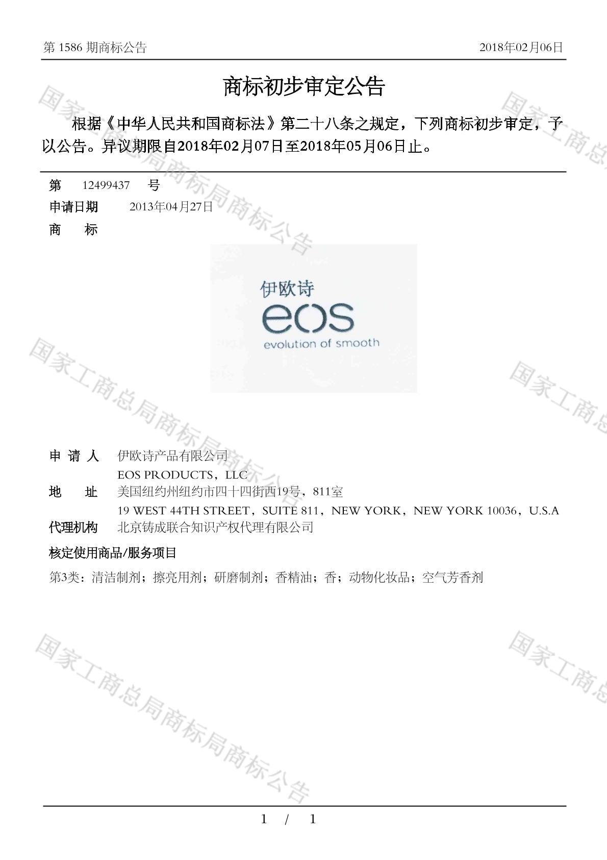 伊歐詩 EOS EVOLUTION OF SMOOTH: 商標初步審定公告