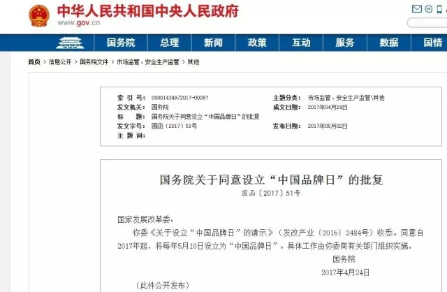 你委《關於設立“中國品牌日”的請示》(髮改産業〔2016〕2484號)收悉。衕意自2017年起,將每年5月10日設立爲“中國品牌日”。具體工作由你委商有關部門組織實施。